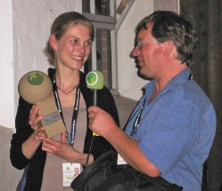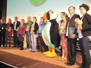 Erhielten für ihren Film über Rotmilane den ersten Preis in der Kategorie „Bester unabhängiger Film“: Sarah Herbort und Robin Jähne, links im Bild Moderator Christian Schröder. | | Gruppenbild mit dem Festival-Maskottchen, dem Papageitaucher Palle: Die Greenscreen-Preisträger 2013. Fotos: Andreas Ewels |