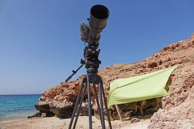 Unser Camp auf einer einsamen Insel irgendwo im Omanischen Meer: Bei 50 Grad ist das Sonnensegel lebenswichtig. Von dort aus steuerten wir die Kamera direkt am Falkenbrutplatz.