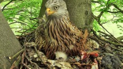 | | "Hallo, da bin ich" - ein frisch geschlüpftes Küken schaut unter der Rotmilanmutter heraus.
