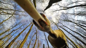 Plötzlich kommt ein Schnabel ins Bild. Vogelfreunde erkennen ihn gleich: Es ist ein Kranich. Er beugt sich herunter, scheint direkt auf die Zuschauer zuzukommen. Dann wird erkennbar - die Kamera ist ein einem Ei versteckt und das Kranichweibchen schickt sich gerade an, ihr Brutgeschäft fortzusetzen.